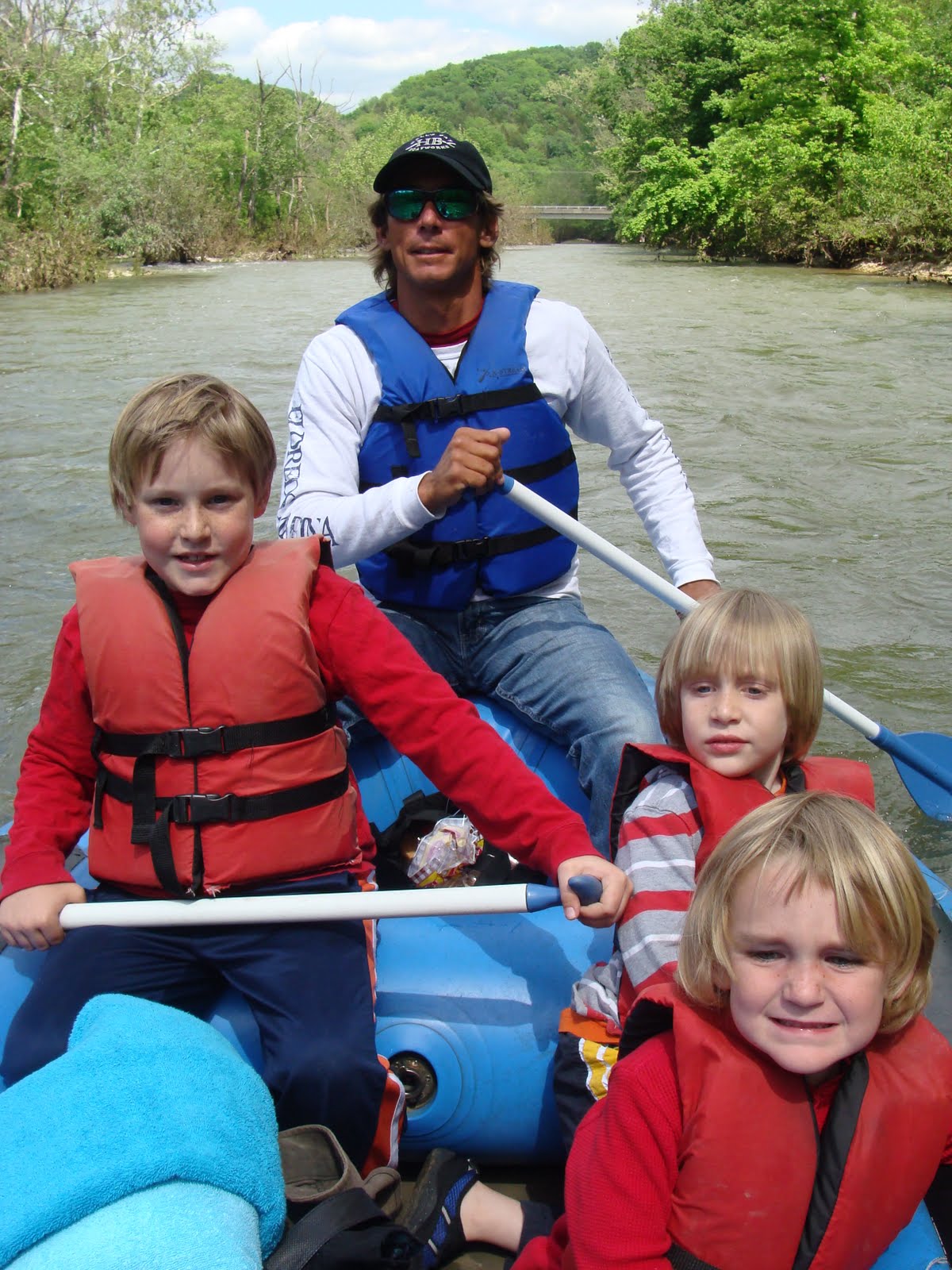 With all the rains we've had in the area lately, the river was definitely "up" & running. Some of the rapids we encountered were most likely a II, but it was all very safe and a perfect way to introduce our brood to the sport my husband Mark & I love so much.